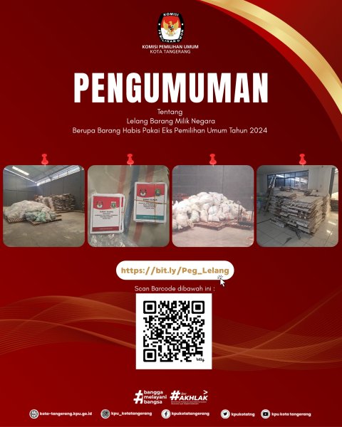 Berdasarkan Persetujuan Penjualan Barang Milik Negara Nomor 2527/RT.01.3-SD/05/2025 tanggal 25 Juli 2025 dan Surat Penetapan Jadwal Lelang Nomor JL-1304/1/KNL.0603/2025 tanggal 2 September 2025 Kantor Komisi Pemilihan Umum (KPU) Kota Tangerang akan melaksanakan Lelang Non Eksekusi Barang Milik Negara (BMN) berupa Barang Habis Pakai Eks Pemilihan Umum tAHUN 2024 dengan peran Kantor Pelayanan Kekayaan Negara dan Lelang (KPKNL) Tangerang II, melalui Aplikasi Lelang dengan jenis penawaran Lelang Open bidiing. Untuk pengumuman klik disini ....