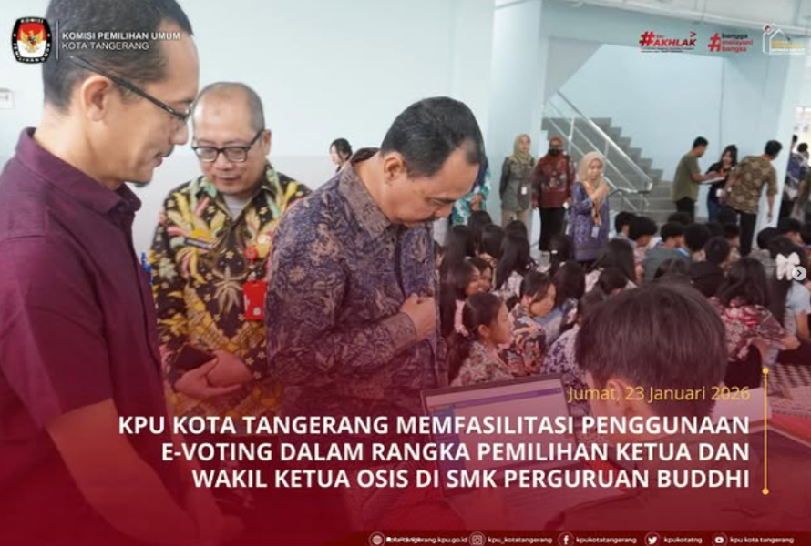 Kota Tangerang, Jumat (23 Januari 2026) — Komisi Pemilihan Umum (KPU) Kota Tangerang memfasilitasi penggunaan sistem e-voting dalam pelaksanaan pemilihan Ketua dan Wakil Ketua OSIS di SMK Perguruan Buddhi. Kegiatan ini merupakan bagian dari program pendidikan pemilih yang bertujuan mengenalkan proses pemilu modern kepada pelajar sejak dini. Melalui kegiatan ini, para siswa diberikan pengalaman langsung dalam menggunakan teknologi pemungutan suara secara elektronik. Penerapan e-voting diharapkan dapat meningkatkan pemahaman siswa tentang tata cara pemilihan yang transparan, efektif, dan akuntabel. KPU Kota Tangerang menilai pelajar sebagai pemilih pemula memiliki peran penting dalam masa depan demokrasi. Oleh karena itu, edukasi kepemiluan tidak hanya diberikan melalui materi, tetapi juga praktik langsung agar siswa dapat memahami proses pemungutan suara secara nyata. Selama pelaksanaan kegiatan, siswa tampak antusias mengikuti tahapan pemilihan, mulai dari proses registrasi pemilih hingga pemberian suara menggunakan perangkat e-voting yang telah disiapkan. Kegiatan ini juga menjadi sarana pembelajaran bagi siswa mengenai pentingnya menjaga integritas dan kejujuran dalam setiap proses pemilihan. Pihak sekolah menyambut positif kolaborasi dengan KPU Kota Tangerang. Menurut pihak SMK Perguruan Buddhi, penggunaan e-voting dalam pemilihan OSIS memberikan pengalaman berharga bagi siswa serta mendorong terciptanya budaya demokrasi di lingkungan sekolah. Melalui kegiatan ini, KPU Kota Tangerang berharap generasi muda semakin sadar akan pentingnya partisipasi politik dan siap menjadi pemilih yang cerdas, aktif, serta bertanggung jawab pada pemilu mendatang.