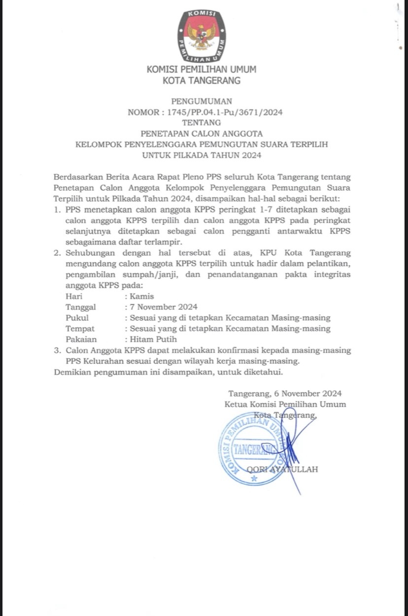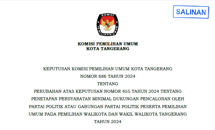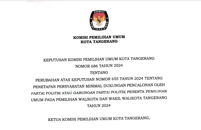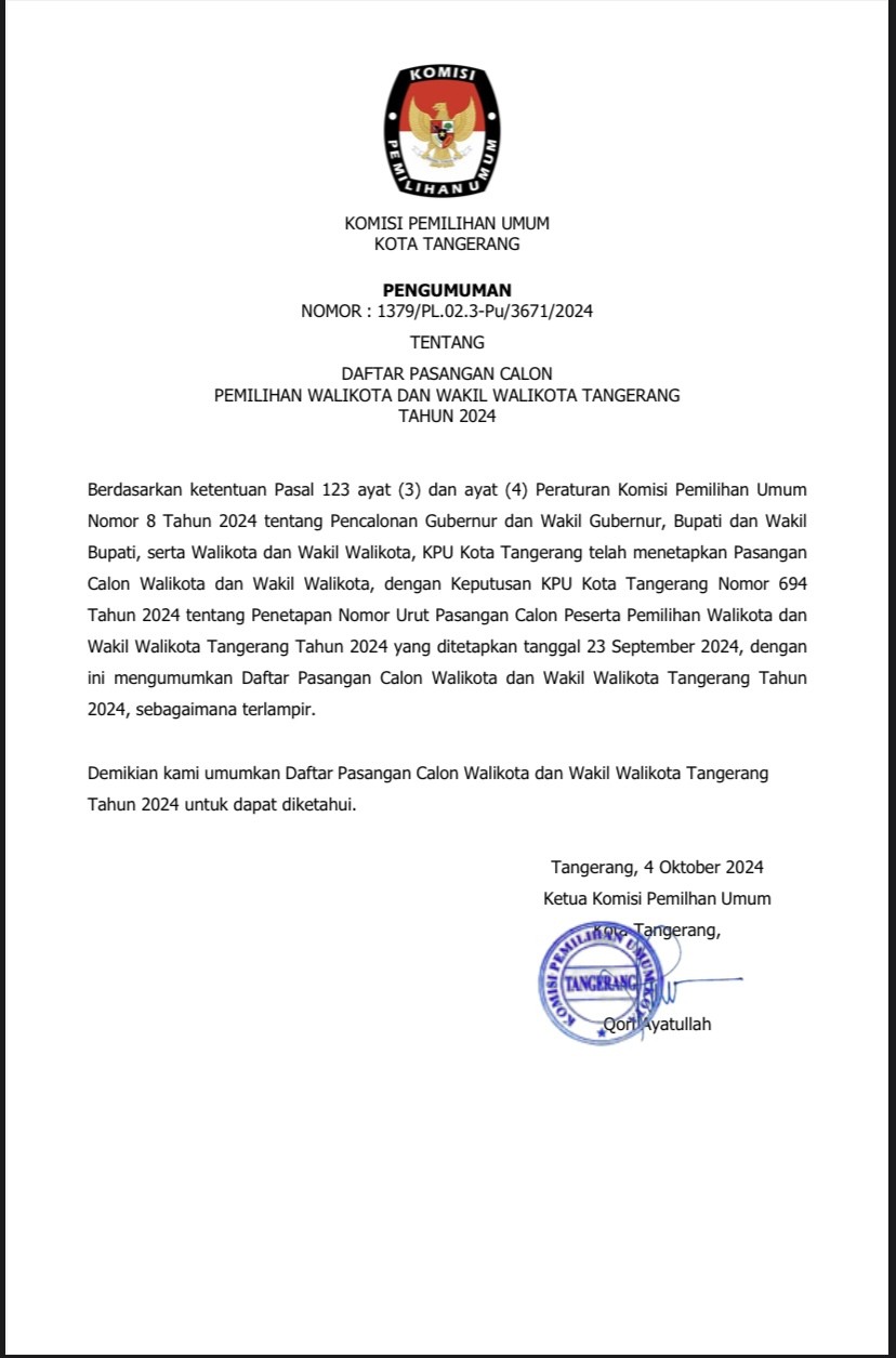 Bahwa untuk melaksanakan ketentuan Pasal 95 ayat (1) Peraturan KPU Nomor 8 Tahun 2024 tentang Pencalonan Gubernur dan Wakil Gubernur, Bupati dan Wakil Bupati, serta Walikota dan Wakil Walikota, Komisi Pemilihan Umum/Komisi lndependen Pemilihan Kata Tangerang mengumumkan Pendaftaran Pasangan Calon Walikota dan Wakil Walikota Tangerang Tahun 2024 sebagai berikut: