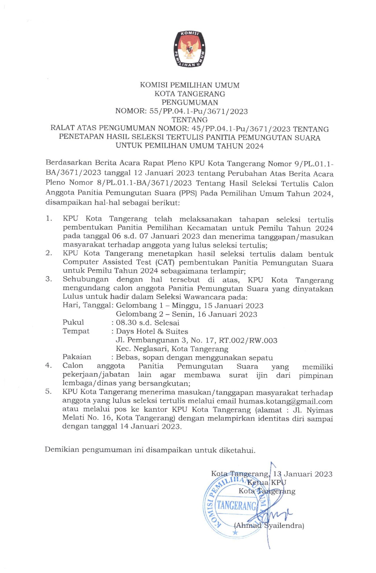 RALAT ATAS PENGUMUMAN NOMOR: 45/PP.04.1-Pu/3671/2023 TENTANG PENETAPAN HASIL SELEKSI TERTULIS PANITIA PEMUNGUTAN SUARA UNTUK PEMILIHAN UMUM TAHUN 2024