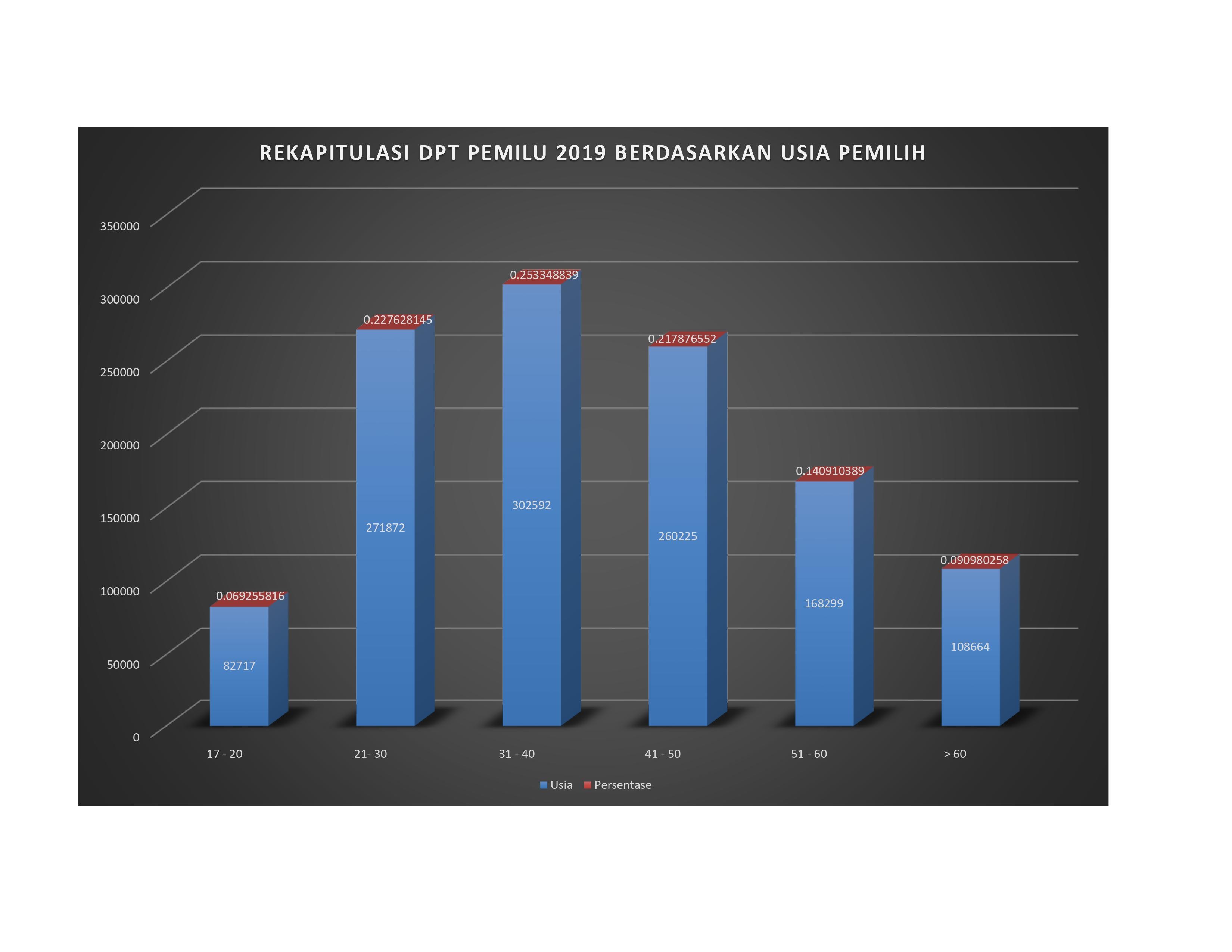 Usia 17 - 20 Tahun, 21 - 30, 31 - 40, 41 - 50, 51 - 60 dan lebih dari 60 Tahun dari data DPT Pemilihan Umum sebanyak 1.194.369 Pemilih dapat dihasilkan data sebagai berikut: