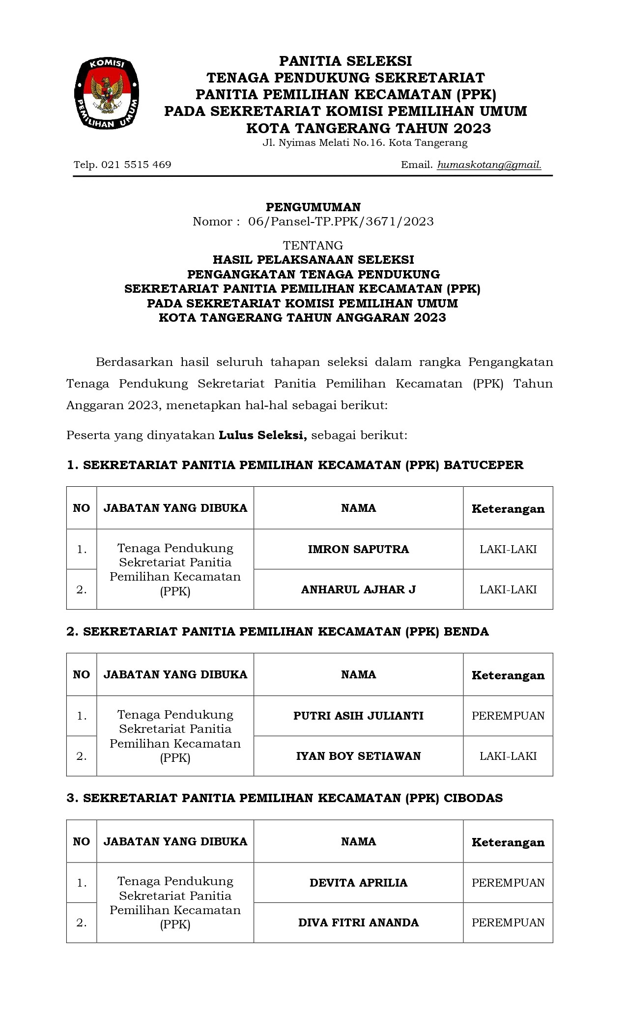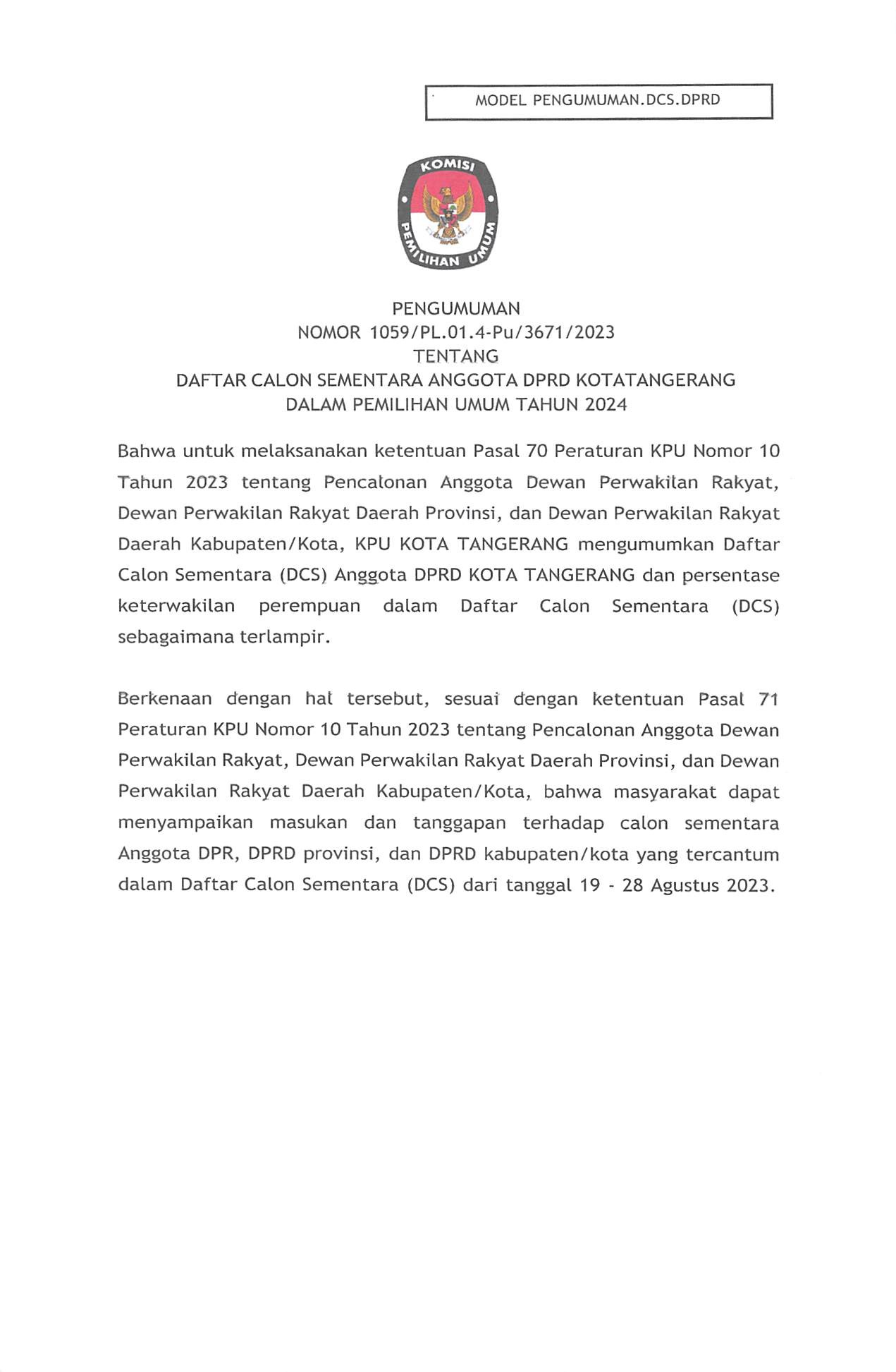 Kota Tangerang - KPU Kota Tangerang tengah melakukan verifikasi administrasi (Vermin) perbaikan dokumen persyaratan dari 763 bakal calon anggota legislatif (Bacaleg) DPRD Kota Tangerang pada Pemilu 2024 mendatang. Berdasarkan data yang ada, 763 bacaleg tersebut terdiri dari 285 bacaleg perempuan dan 478 bacaleg laki-laki. Mereka tersebar di lima Daerah Pemilihan (Dapil), Dapil 1 meliputi Tangerang dan Karawaci, Dapil 2 Meliputi Cipondoh, Pinang dan Batuceper, Dapil 3 meliputi Neglasari dan Benda, Dapil 4 meliputi Ciledug, Karangtengah dan Larangan, Dapil 5 meliputi Cibodas, Periuk dan Jatiuwung. Komisioner Divisi Teknis dan Penyelenggara KPU Kota Tangerang, Rustana mengatakan bahwa tahapan perbaikan dan penggantian dokumen persyaratan bacaleg telah selesai dilakukan beberapa waktu lalu. Dari 18 parpol yang mengajukan bacaleg, tercatat ada 18 parpol yang mengajukan penggantian dokumen persyaratan bacaleg, yang artinya semua Parpol peserta pemilu mengajukan perbaikan dan penggantian dokumen persyaratan bacaleg. "Tahapan perbaikan dan penggantian dokumen persyaratan bacaleg telah dilakukan, tahapan itu dimulai sejak tanggal 10 Juli hingga 31 Juli 2023 kemarin. Dan saat ini tahapan verifikasi dokumen persyaratan bacaleg. Sebanyak 763 dokumen bacaleg dicek satu per satu kembali, seperti KTP, ijazah, surat kesehatan, surat keterangan dari Pengadilan Negeri (PN), dan lain lainnya dicek kebenarannya. Pengecekan ini dilakukan hingga 6 Agustus 2023 nanti," ujar Rustana, pada Kamis (03/08/2023). Rustana menjelaskan, setelah tahap verifikasi administrasi dokumen persyaratan bacaleg ini nanti akan dilanjutkan dengan tahapan pencermatan Daftar Caleg Sementara (DCS) yang dimulai dari 6 hingga 11 Agustus 2023. "Dalam tahapan tersebut parpol masih memiliki kesempatan untuk mencermati hasil verifikasi administrasi, apakah sudah sesuai apa belum baik itu nomor urut dan dapil dari para bacaleg," jelasnya singkat. Rustana pun menerangkan bahwa pasca pencermatan DCS nanti akan dilanjutkan dengan pengumuman daftar bacaleg untuk mendapatkan tanggapan masyarakat sebelum dilakukan penyusunan rancangan Daftar Caleg Tetap (DCT) hingga penetapan akhirnya penetapan DCT. Untuk diketahui, dari 763 bacaleg sebanyak 659 bacaleg telah dinyatakan Memenuhi Syarat (MS) dan 104 bacaleg yang dinyatakan Tidak Memenuhi Syarat (TMS). Dan untuk bacaleg yang TMS, dominasi ditemukan persyaratan dokumen yang tidak diperbaiki maupun ijazah yang belum dilegalisir. (HUMAS)