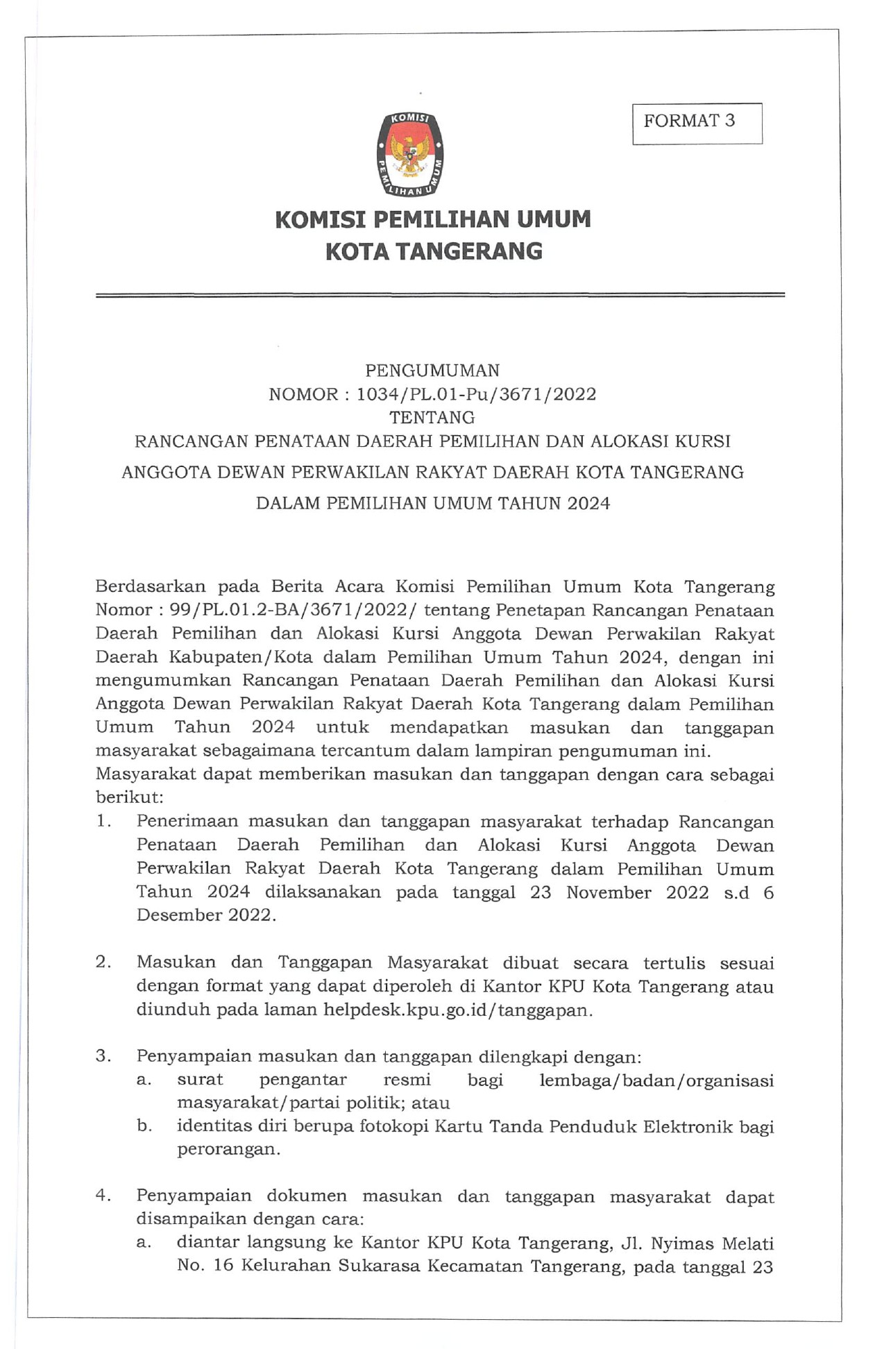 PENGUMUMAN RANCANGAN PENATAAN DAERAH PEMILIHAN DAN ALOKASI KURSI ANGGOTA DEWAN PERWAKILAN RAKYAT DAERAH KOTA TANGERANG DALAM PEMILIHAN UMUM TAHUN 2024 Rabu, 23 November 2022 07:00 912 RANCANGAN PENATAAN DAERAH PEMILIHAN DAN ALOKASI KURSI ANGGOTA DEWAN PERWAKILAN RAKYAT DAERAH KOTA TANGERANG DALAM PEMILIHAN UMUM TAHUN 2024 Baca Selengkapnya