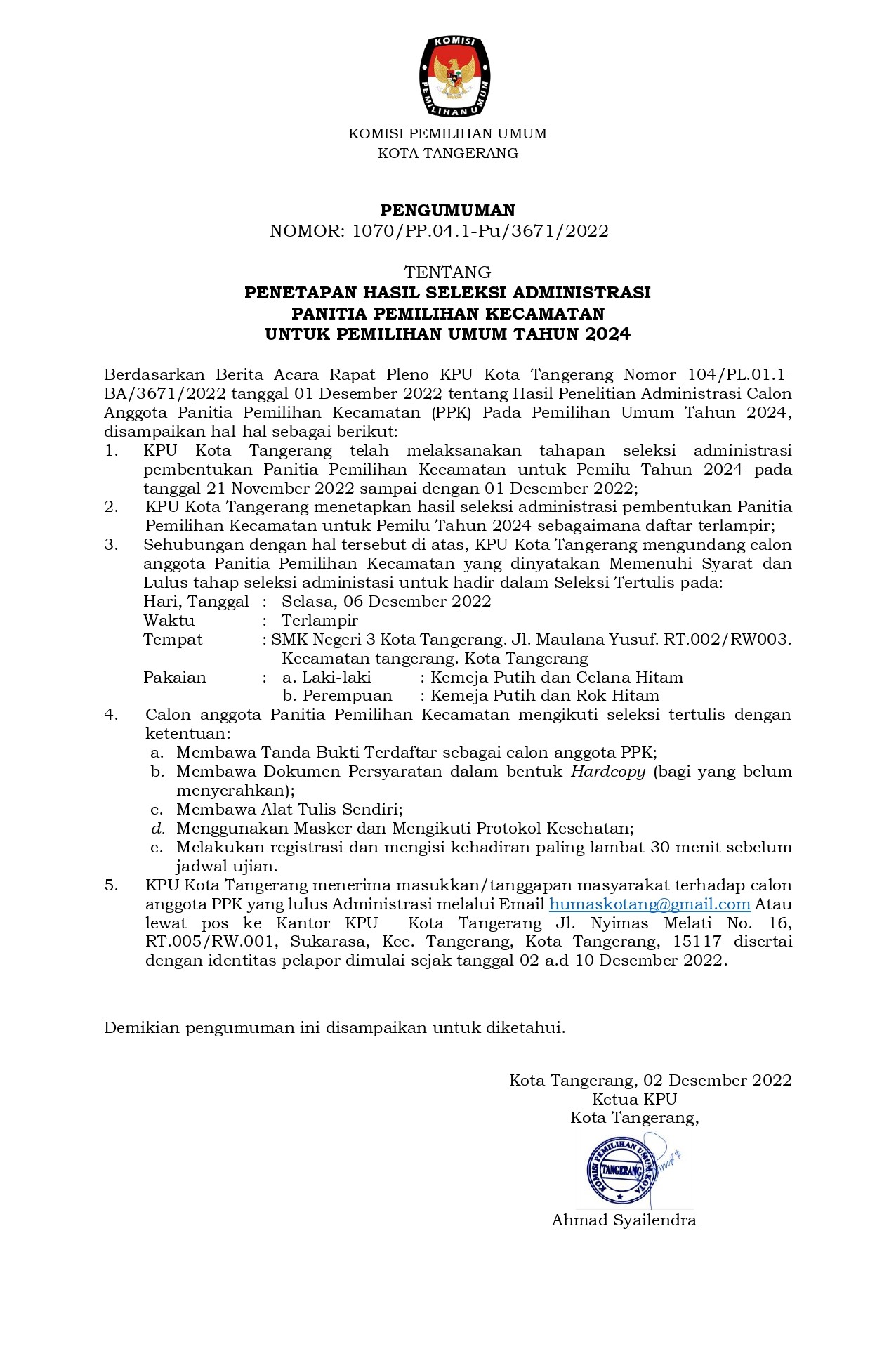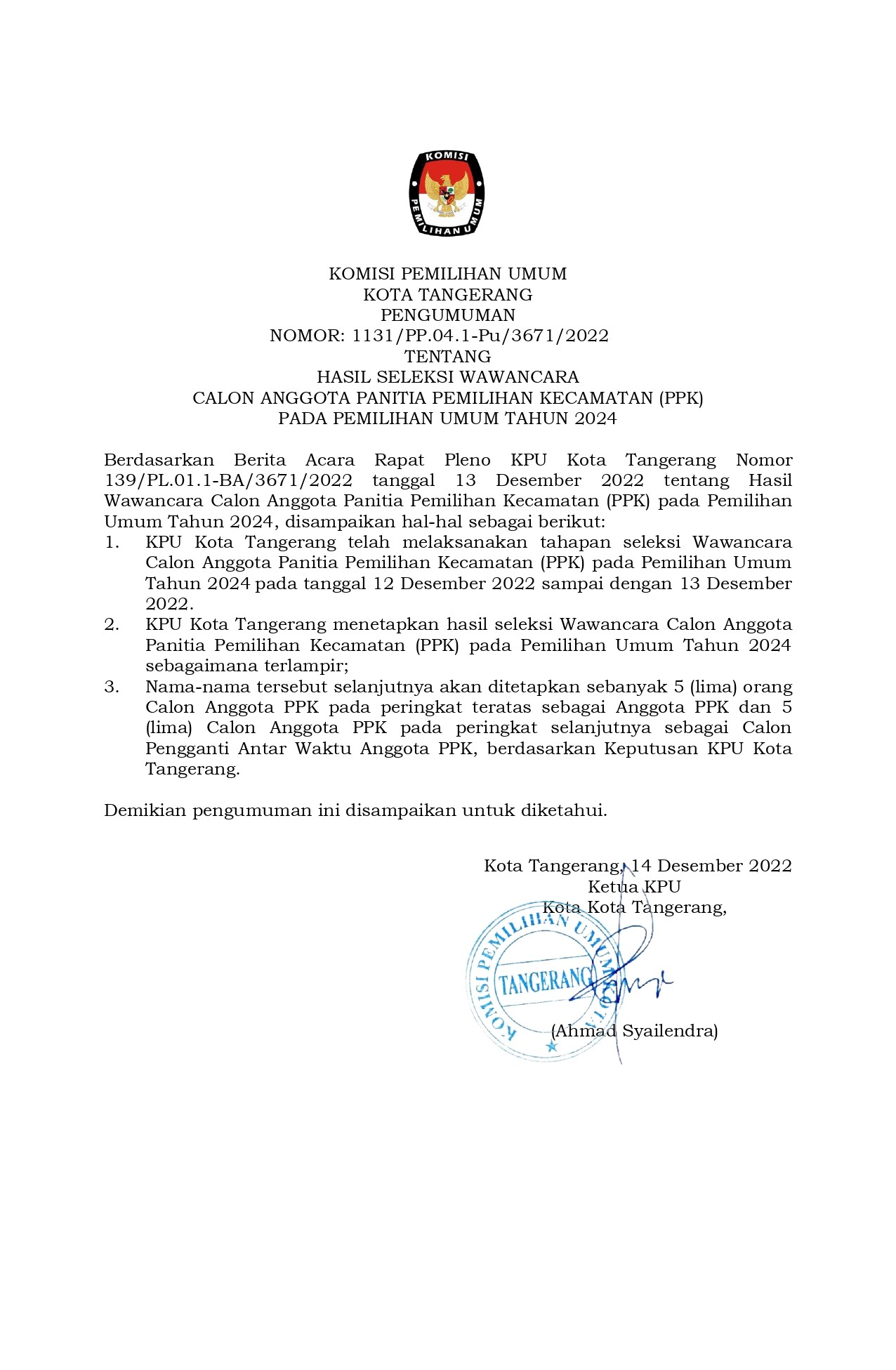 RALAT ATAS PENGUMUMAN NOMOR: 1105/PP.04.1-Pu/3671/2022 TENTANG PENETAPAN HASIL SELEKSI TERTULIS PANITIA PEMILIHAN KECAMATAN UNTUK PEMILIHAN UMUM TAHUN 2024 Jumat, 09 Desember 2022 20:58 104 RALAT ATAS PENGUMUMAN NOMOR: 1105/PP.04.1-Pu/3671/2022 TENTANG PENETAPAN HASIL SELEKSI TERTULIS PANITIA PEMILIHAN KECAMATAN UNTUK PEMILIHAN UMUM TAHUN 2024 Silahkan download disini Baca Selengkapnya