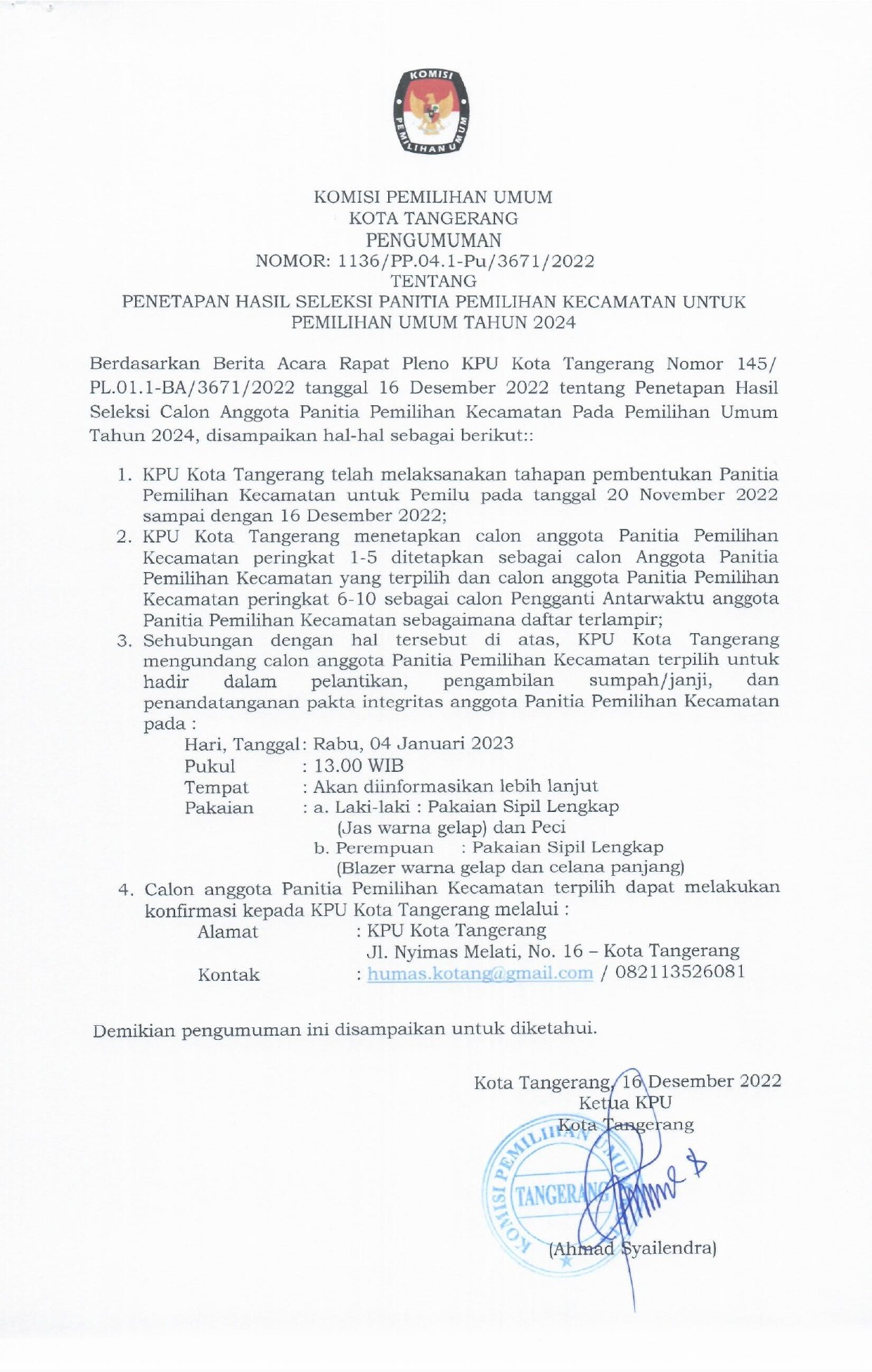 PENGUMUMAN PENETAPAN HASIL SELEKSI PANITIA PEMILIHAN KECAMATAN UNTUK PEMILU TAHUN 2024 Jumat, 16 Desember 2022 07:00 937 PENETAPAN HASIL SELEKSI PANITIA PEMILIHAN KECAMATAN UNTUK PEMILU TAHUN 2024, KLIS DISINI Baca Selengkapnya